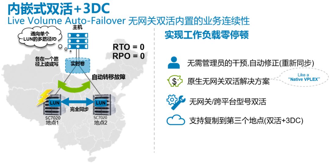 ▲基于戴尔易安信SC系列存储Live Volume的两地三中心解决方案示意图 戴尔易安信SC系列存储内置Live Volume灾难恢复/业务连续性解决方案,用户无需联通交换机或仲裁设备,无需安装额外软件,只需两步,即可构建双活系统,满足企业客户在逻辑故障和物理故障两个层面对存储系统高可用性的需求!