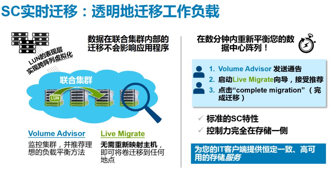 SC系列存储内嵌Live Migrate功能,能够将SC3000/5000/7000/9000等型号以及Equalogic系列,构建为一个“存储联邦”,实现横向扩展。用户无需中断工作负载或者重新配置主机,即可在本地、园区、城域或者全球范围内以透明的方式随意移动数据。