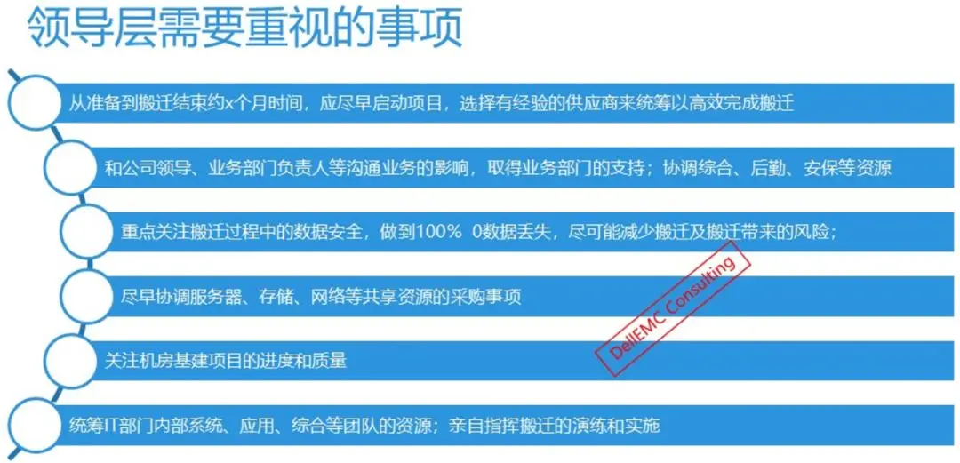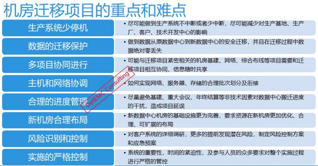 在实际运用中,我们的咨询服务器团队向M公司详细介绍了戴尔易安信的数据中心(机房)的迁移方法论,并对迁移常见问题及重点和难点进行了讲解,确保整个迁移工作的平稳有序,风险降到最低。
